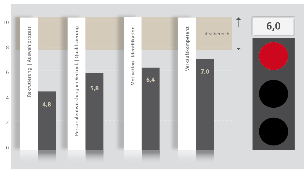Die Qualität der Vertriebsorganisation und die Einstellung zur Zielerreichung beeinflusst das Unternehmensergebnis direkt. Welche Bedeutung hat der professionelle Vertrieb bei Ihnen? Welche Fähigkeiten und Kompetenzen benötigen MA und Führungskräfte zum Erfolg? Im ganzheitlichen Vertriebsaudit 360© werden sowohl Management, Vertriebsleiter, die beteiligten Mitarbeiter involviert. Die Analyse erhebt die Potenziale in folgenden vier Vertriebskernpunkten.